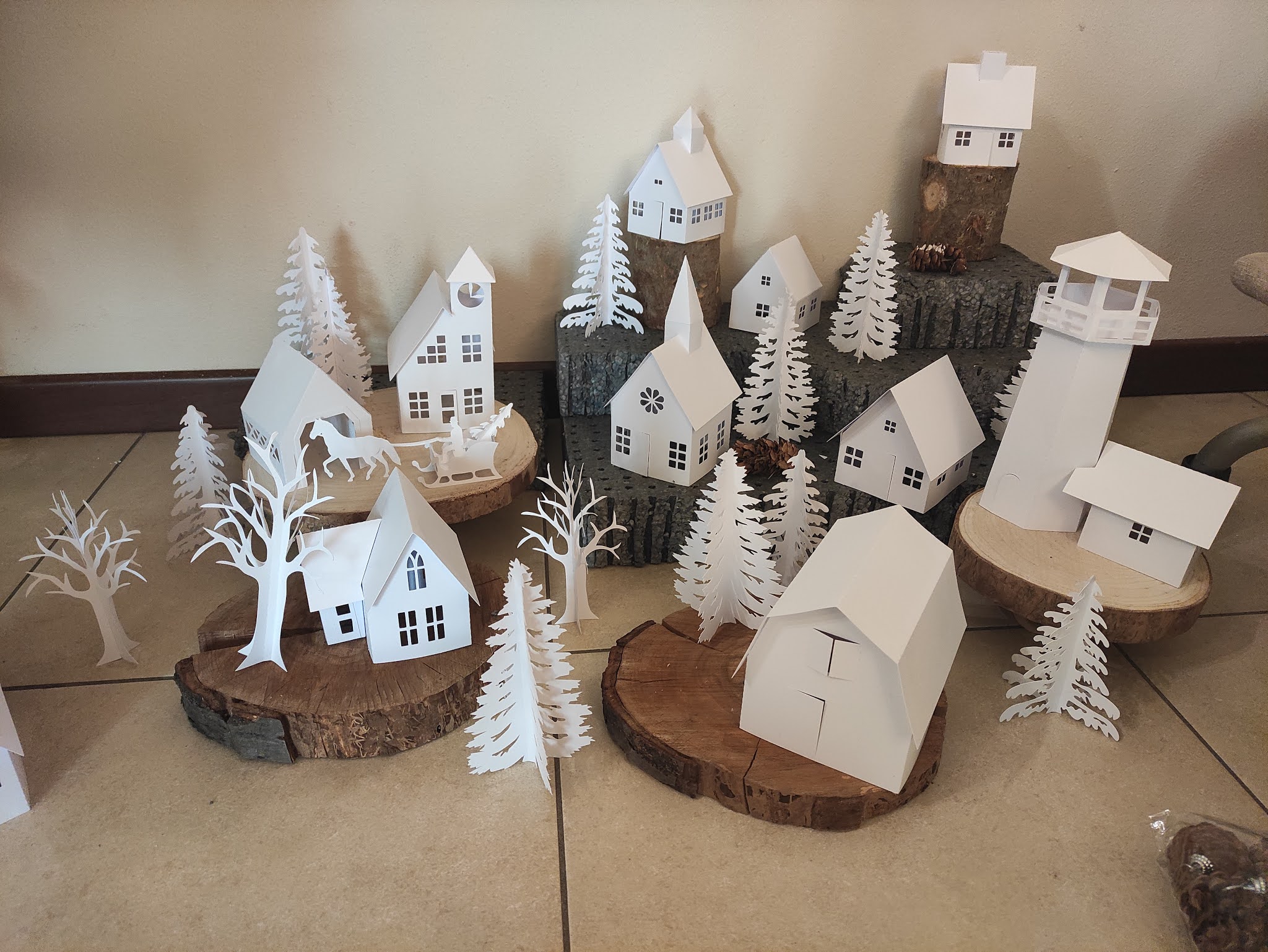 Poi, navigando in rete ho visto dei villaggi di Natale, stile presepe, dove venivano utilizzate come basi queste lamelle di tronco (non ho idea di come si chiamino o se abbiano effettivamente un nome). ed ecco che si è accesa la lampadina.